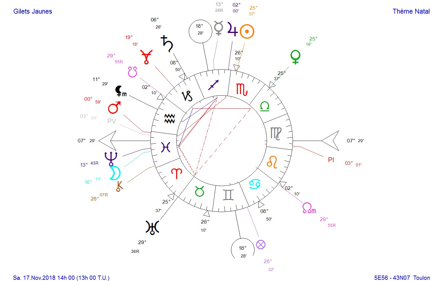 Le thème natal du mouvement « Gilets jaunes » s’inscrit avec un Mercure immobile devenant rétrograde. Il s’agit dès le départ d’un problème de dialogue. Mercure est la parole, mais aussi l’écoute et le mouvement. Hors, le dialogue n’a à aucun moment pu s’établir. La première nouvelle Lune de ce mouvement (voir article sur ce blog) a confirmé ce blocage, car tant Mercure que Vénus étaient « interceptés », attendant d’être consultés tandis que les autres planètes s’occupaient à tout autre chose. Le résultat est qu’aujourd’hui, nous ne voyons aucune avancée.